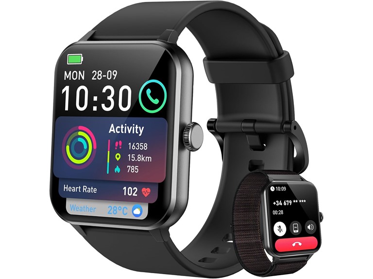 - đăDIY Watch Faces & 2 Pack Watch StrapsăFashionable smartwatches for men and women are constructed from a special aluminum alloy material, which comes with two types of watch straps - Nylon watch straps and silicone watch straps. You can choose the background image for your watch face (your family, pets, or other photos that you like), and download and use it through the "Da Fit" app on the 1.85-inch full-touch HD screen. The system offers over 100 watch faces to choose from as well.
