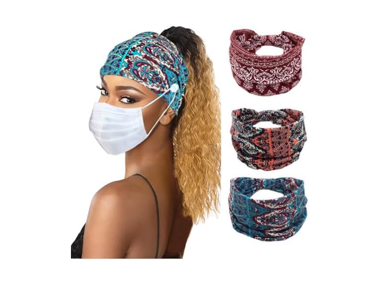 - (1) Efdagsad Boho Button Headband Women Wide Mask Hair Band with Button Boho Elastic Sports Headwear Yoga Ear Saver Hair Band Workout Headwrap (C)