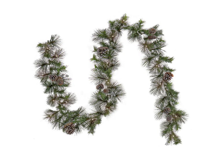 This Whitter Pine garland features a mixture of evergreen and bristle branch tips trimmed with glitter, snow-dusted pinecones, and white berries. It is pre-lit with 50 battery operated warm white LED lights that are energy efficient and long lasting. Included is an option for 6 hours ON/18 hours OFF timed operation. This garland can be displayed over doors, windows, fireplace mantels, fence, or stairway railings. For indoor or outdoor display.