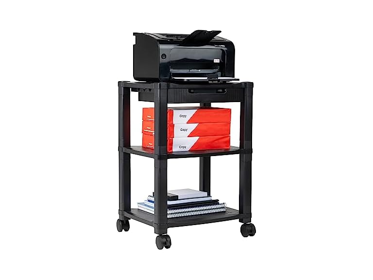 - Maximize Workspace: Reclaim valuable workspace by adding this three-tier printer cart to your workstation, providing a space-saving solution for your printer and other equipment. It can be used under your desk or you can build it without the wheels and place it on your desk. The simple, no tool assembly is fast and can be altered at any time to accommodate various settings