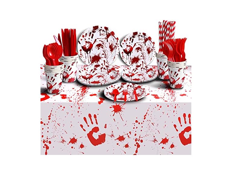 - Value Package: our Horror Halloween party tableware set includes: 20PCS 9-inch meal plates, 20Pcs 7-inch dessert plates, 20PCS 9oz paper cups, 20PCS Straw, 20PCS napkins, 20PCS Spoon, 20PC Fork 20PCS knives, 1 tablecloth(108 x 54 inches), serves 20 guests.