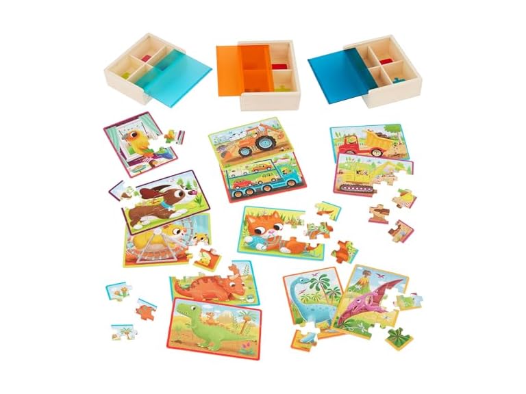 - Wooden Puzzle Set: Discover eight 12-piece puzzles inside 3 wooden boxes that are made with little puzzlers in mind!