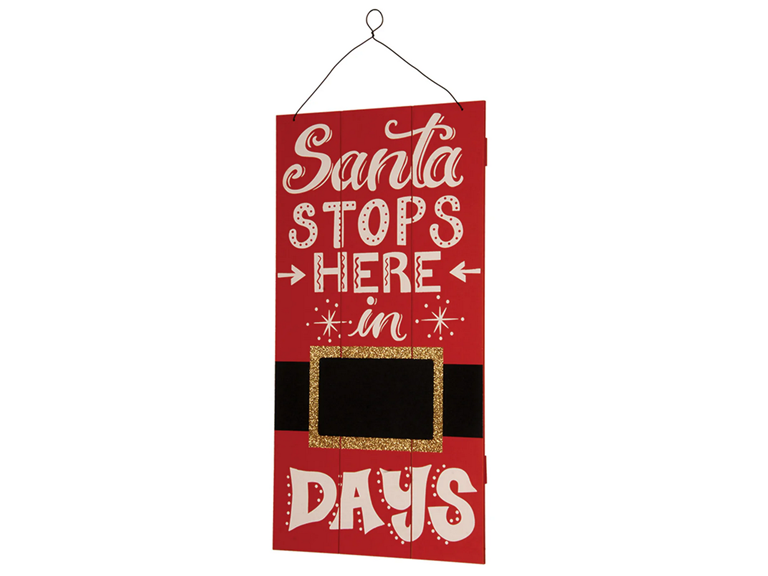 The Santa Countdown Red Wooden Wall Sign is a fun and festive addition to your holiday decor! Let everyone know how many days away Santa's arrival will be. This bright red sign with decorative white lettering features a simulated belt and buckle containing an erasable chalkboard to easily keep track of the days until Christmas. This chalkboard feature allows you to make it interactive and perfect for families. The red wood adds a classic touch, and the hanging wire makes it easy to display. It would look great in an entryway, kitchen, or family room.