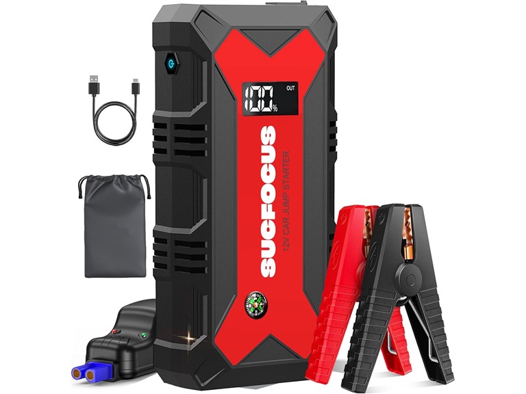 - 【More Powerful Jump Starter】SUCFOCUS self jump starter battery pack can quickly jump start a dead car battery. Even if the battery voltage is too low, pressing the "RST" button will force the car to restart. With boosted 4000A peak current, the SUCFOCUS car battery jump starter power pack can restart your 12V vehicles (Up to 9.0L gas/7L diesel engines) in seconds with a 45 C high-rate lithium battery. Suitable for cars, trucks, motorcycles, SUV, ATV, UTV, dirt bike, snowmobile, boats, lawnmowers, trailer, RV, tractor and so on. Up to 20 jump starts on a single charge.