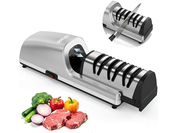 - (1) LEFUGO Electric Knife Sharpener for Kitchen Knives, Detachable Sharpening Head, 3-Stage Knife Sharpener Electric, 100% Diamond Abrasive, 15-Degree Precision Angle, Fast Sharpening, Polish (Silver)