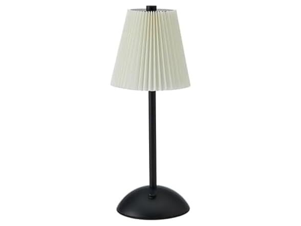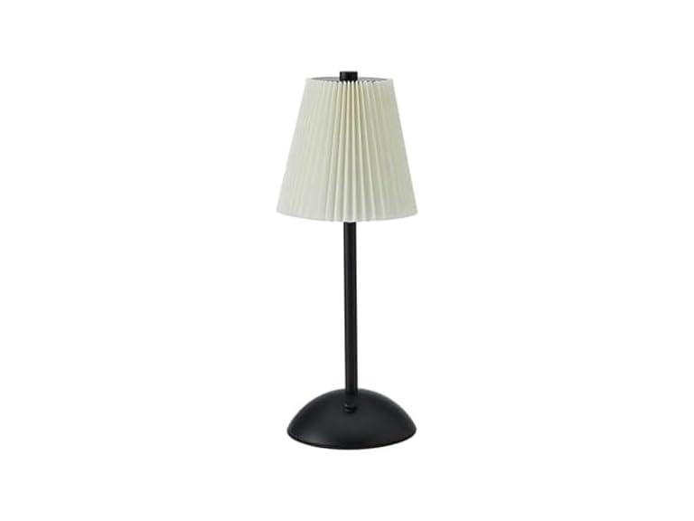 - DURABLY MADE: This rechargeable lamp is made to stand up to daily use and bring enjoyment for years to come. Made of metal with a powdercoat finish and fabric and PVC shade, and featuring a plastic nonslip pad on bottom to prevent scratching.