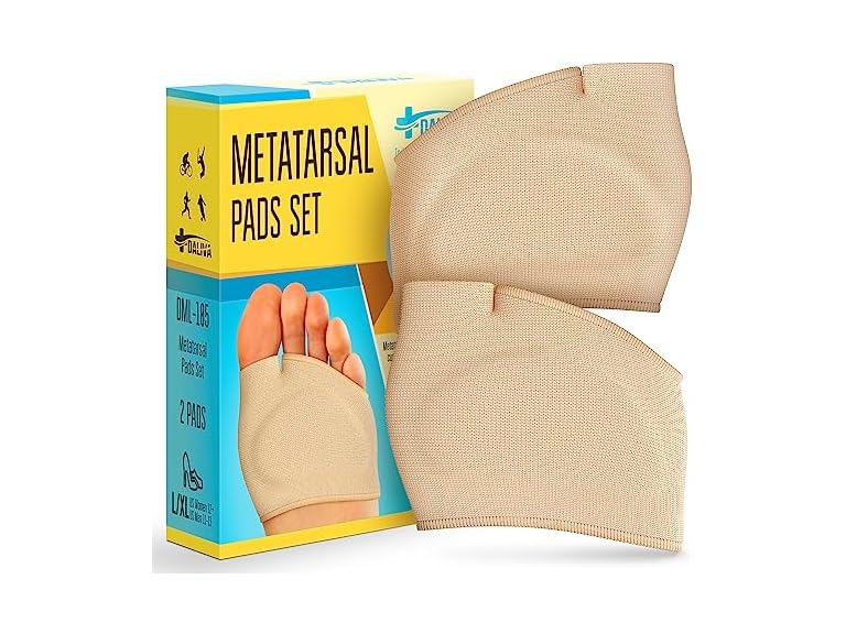 Metatarsal foot pads are designed to provide an excellent solution for your foot problems such as ball of foot disorders, flat feet, burning pain from high heels, running, and other high-intensity activities. Choose carefully your size according to the size chart. Metatarsal pads women conform to the shape of your feet, enhance the comfort of your feet by absorbing shock, and decrease the pressure of body weight on the metatarsal bone, especially the big toe joint. If you have blisters, wet corns, skin damages, reaction to gel, we do not advise you to use the metarsal pads for women. As soon as you experience discomfort or irritation when wearing the product, please take it off and ask the advice of your doctor. KEY FEATURES EFFECTIVE: Metatarsalgia insoles recommended by medical specialists, the metatarsal pads mens ensures all-day relief from forefoot sole pain, calluses, dry corns, bunions, and ball of foot pain. Foot orthoses with metatarsal cushion may help redistribute and relieve pressure, adjust disorder to comfortable wear of shoes. Mortons neuroma inserts helps protect the sole corn or callus from irritation and relieves pain and pressure. QUALITY: Sewed-in medical-grade gel cushions guarantee durability and a stable cushioning effect for feet. Shoe pads for pain relief remain effective for a long time. Stretchable and breathable fabric of forefoot met pads ensures comfort and suits most people. They can easily be cleaned and used again. WHY DO PEOPLE CHOOSE THE DALIVA METATARSAL INSOLES SET? Protects the foot pads ball of foot pain without side effects. Suitable for men and women. Can be used during everyday activities. Easy to wash and reuse Plantillas para zapatos de mujer