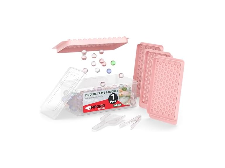 - Emporio Kitchen Round Ice Cube Tray Set Pack of 1, BPA-Free Stackable Trays with Lid & Tongs, 104 Ice Balls Per Tray for Whiskey, Drinks, and Cocktails, Quick Release Round Ice Cube Mold, Pink