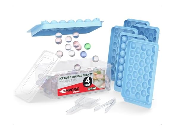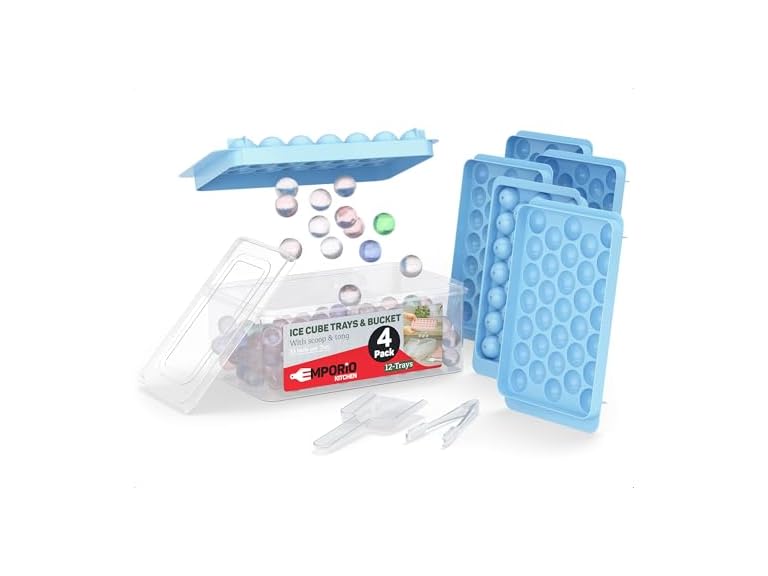 - Emporio Kitchen Round Ice Cube Tray Set Pack of 4, BPA-Free Stackable Trays with Lid & Tongs, 33 Ice Balls Per Tray for Whiskey, Drinks, and Cocktails, Quick Release Round Ice Cube Mold, Blue