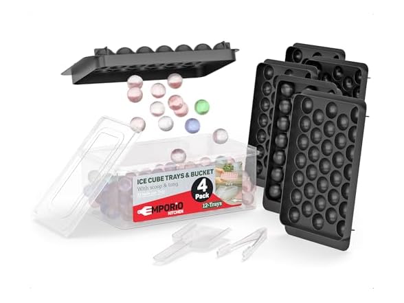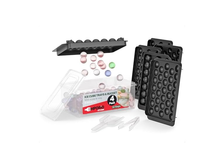 - Emporio Kitchen Round Ice Cube Tray Set Pack of 4, BPA-Free Stackable Trays with Lid & Tongs, 33 Ice Balls Per Tray for Whiskey, Drinks, and Cocktails, Quick Release Round Ice Cube Mold, Black