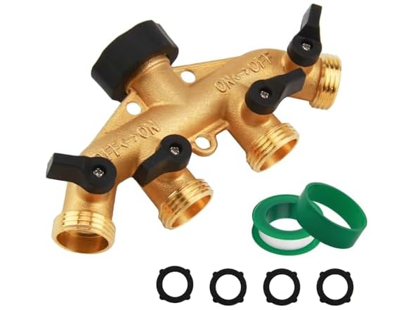- (1) ENNSOO Water Hose Splitter Durable 4 Way Heavy Duty Brass Hose Adapter, 3/4" Spigot with Four Independent Valves, Ideal for Outdoor Faucet and Hose Bib Applications