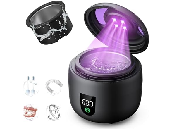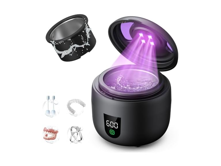 - 45kHz Ultrasonic and 4-UV Lights: This ultrasonic retainer cleaner uses 45kHz high-frequency sound waves, easily removing dirt from aligners, mouth guards, and dental appliances. It reaches deep into crevices without damaging your items. The 4 built-in UV lights activate when the lid is closed, helping keep your items fresh and clean. This ultrasonic jewelry cleaner also effectively removes grime from your jewelry, keeping it sparkling.