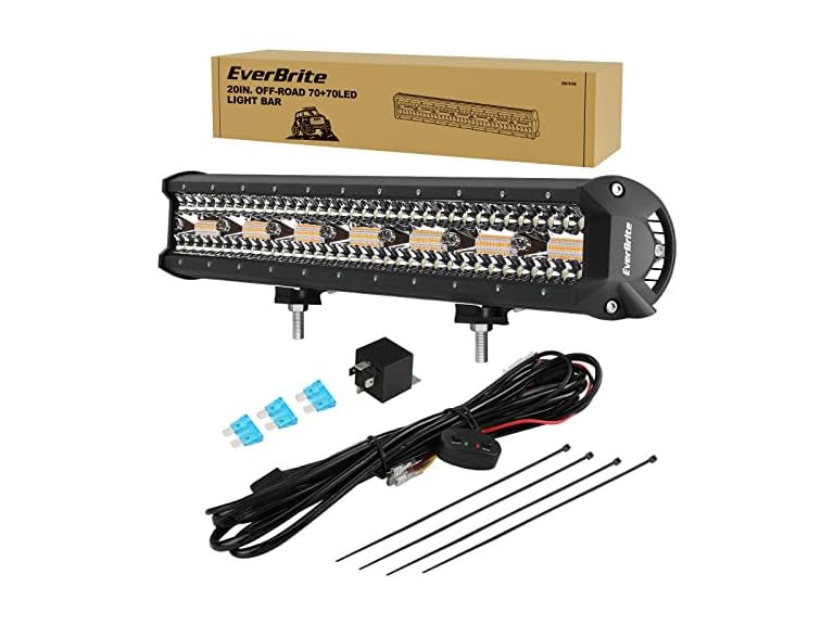 In the box: (1) EverBrite 20Inch 420W Spot Flood ComboLight Bar, Triple Row Car Led Lights, Off-Road Wiring Harness and Remote, IP67 Waterproof, 6 Modes, White & Amber LED for Truck, ATV, UTV, SUV