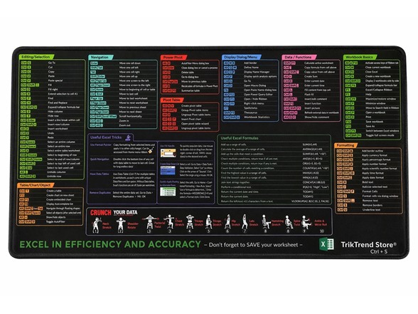 * Quick Excel Reference – Essential keyboard shortcuts, commands, and formulas printed directly on the mat.