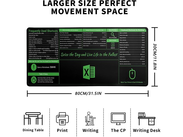 ♥[Extended Mouse Pad Size]:The extended excel shortcut desk pad measures 31.5x11.8x0.12 inches that covers most of the desk. Offers a wide area to have your laptop, mouse and keyboard. You can freely move your mouse without any interruption and don't have to continually adjust the mat as you do with traditional mousepads.