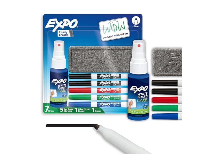 - EXPO Dry Erase Markers Kit, Fine Tip, Assorted Colors, Eraser, Spray Cleaner, 7 Count
