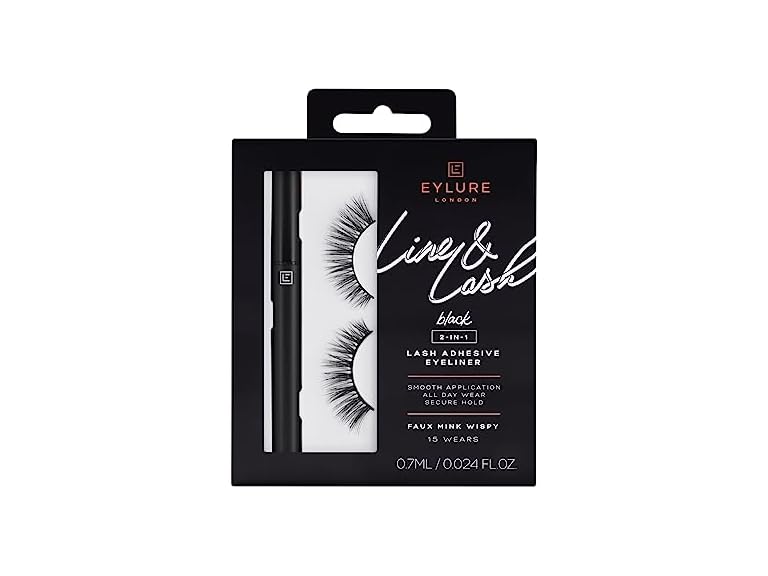 "Line & Lash is a brilliant felt tip eyeliner pen that lays down a super precise line of adhesive that makes lash application as easy as applying your everyday eyeliner. Say goodbye to the messy, sticky glues and hello to fuss free lash application. Since it works with any faux lash, you’re free to choose your own style. The Black Eylure Line & Lash doubles up as a smudge proof liquid eyeliner for an all-day lash look, you’ll love. It gives you perfect lashes with every line! This kit includes a Black Line & Lash eyeliner pen and a pair of fluttery faux mink Wispy lashes. Criss crossed & Wispy, this lash will add length & fullness to define your eyes."