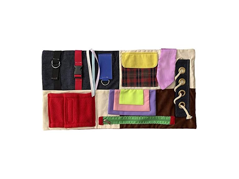 - A light alternative to a busy board with zippers, clips, string and pockets like adult toys to help elderly and young children develop or redevelop motor skills