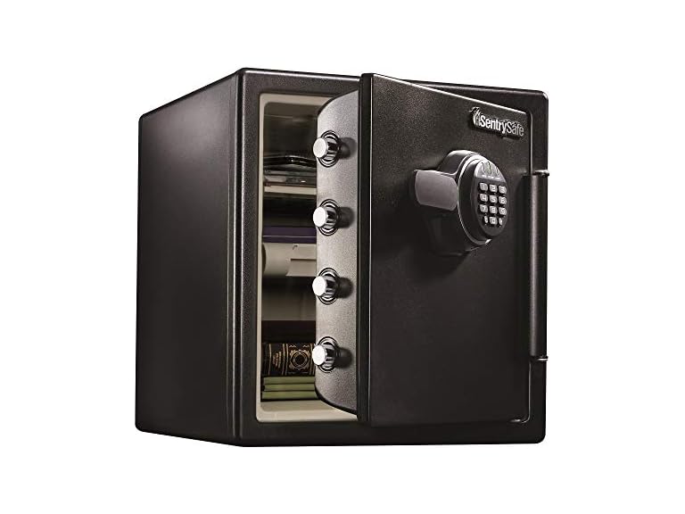 - SentrySafe Fireproof and Waterproof Black Steel Home Safe with Digital Keypad Lock and Organization Trays for Money, Documents, 1.23 Cubic Feet, SFW123EU