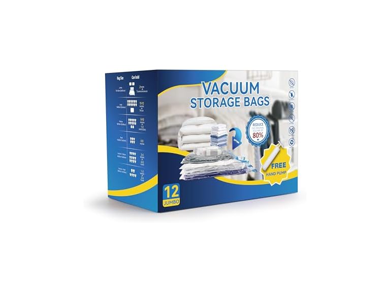 - (1) Simple Deluxe 12 Jumbo Compression Storage Bags, Vacuum Storage Bags, Space Saver Bags for Comforters, Blankets, Bedding, Pillows and Clothes Storage, Hand Pump Included