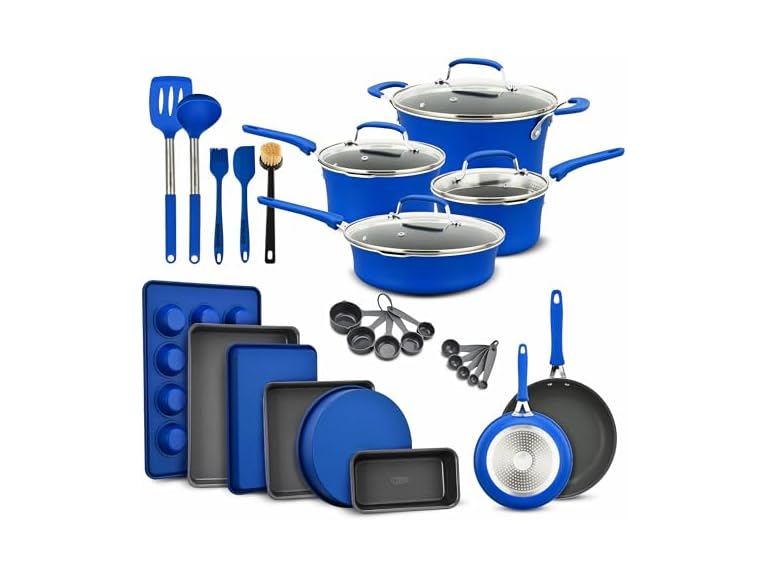 - (1) Bakken- Swiss Pots and Pans Set, 23-Piece Non Stick Cookware & Bakeware Sets with Plaid Pattern, Stackable Design, Dishwasher Safe, Stain-resistant, Oven & All-Stove Safe, Tempered Glass Lid, Blue
