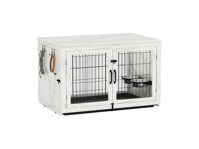 - (1) Piskyet Wooden Dog Crate Furniture with 360°Rotatable Removable Dog Bowls, Dog Crate End Table with Tray, Double Doors Dog Kennels for Dogs(XL:43.2" L*28.6" W*30.3" H, Marble White)