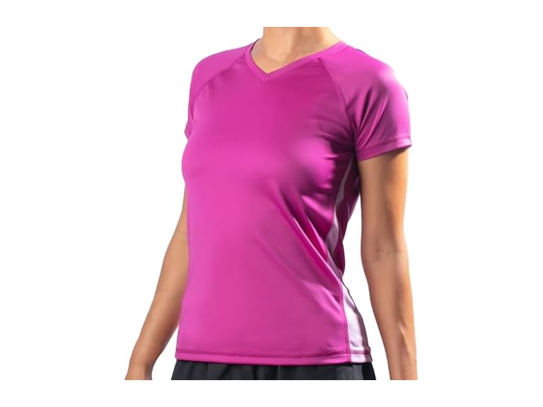 - Short-sleeve rashguard with banded V-neckline, raglan seaming, and contrasting side stripe