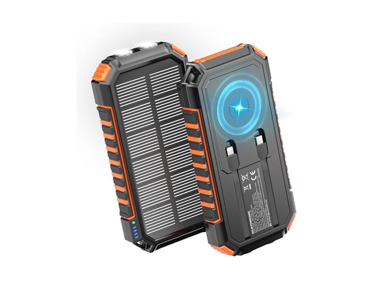 - Massive 27,000mAh Battery Capacity: Stay powered for days with the impressive 27,000mAh battery. Fully charge your iPhone 16 up to 8 times, Galaxy S23 up to 6 times, or iPad Mini 6 up to 4 times. Perfect for power outages, outdoor adventures, or everyday use, this solar power bank delivers reliable, long-lasting energy.