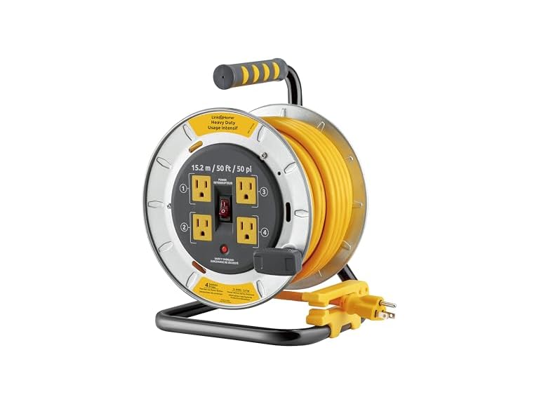 Link2Home Contractor Grade Cord Reel 50 ft. Extension Cord (4) Power Outlets with 12 AWG SJTW Cable is the perfect power solution for your garage, backyard, warehouse space, etc. Tangle-free cord management helps cords stay organized and tidy for next use, combine with the cord locking system, keeps cords in place and secure.