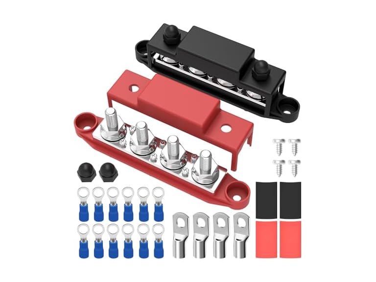 - Product Information: A pair of 12V busbars (red and black) come with screws: 6 x #8, terminal posts: 4 x 3/8" (M10). All terminals of our busbars are made of iron-nickel material, featuring excellent corrosion resistance and conductivity, suitable for use in harsh environments, extending product life.