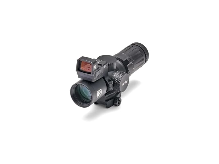 The super short Vudu 3-9x32 rifle scope might just be the perfect optic. The housing is constructed of aircraft-grade aluminum to be compact, lightweight and incredibly durable. This second focal plane design comes in at 6.8” and is fog, water, and shock resistant. The turrets offer ¼ MOA adjustments and are both capped for protection. A rotary dial provides an illuminated reticle with 10 brightness settings and the CR2032 battery provides roughly 300 hours of operation. The unique design provides an integrated base that is also compatible with any aftermarket mini-ACOG mounts. For those wanting a non-magnified solution, EOTECH offers a version that includes a ring mount and EFLX that can be mounted to the front tube section. It can be positioned at the top or at 45-degree offsets for close or moving targets.