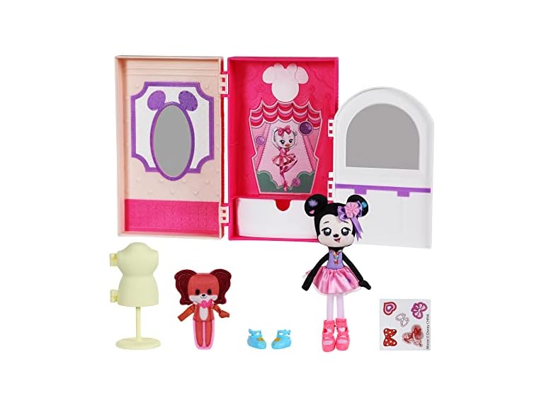 Bring the magical World of Disney to life through imagination and storytelling with Disney Sweet Seams! Each story in a box playset embodies a specialty look and feel with homemade, unique handcrafted-inspired details of your favorite Disney characters you know and love. These whimsical "rag doll" style 6-inch soft Dolls are truly special with homespun elements woven throughout; from their hand painted-inspired features, classic yarn hairstyle, elongated dangling arms and legs with knotted limbs and iconic Disney character outfits. Surprise and delight! Peel away the outer sleeve to discover a story in a box! Slide out the vessel to reveal a soft Doll, Accessories and Stickers to customize and decorate! Find the hidden compartments to reveal surprises. Set up the sleeve packaging as a backdrop scene for additional imaginative play. Hours of storytelling play! This special Sweet Seams Deluxe Pack opens out to reveal Minnie's Ballet Studio with three different play areas - A Dressing Room, Studio and Stage. Minnie Mouse and her sweet pet dog Fifi are ready to Prep, Practice & Perform! Help Minnie practice in front of the mirror to nail the perfect pirouette in her pink Tutu with floral details. She has elongated dangling arms and dangling legs with knotted limbs and whimsical homespun details. Place Minnie on the stage so she can put on a magical performance. Under her stage and in her mannequin, you will find a secret compartment to find two pairs the most beautiful ballet Shoes! Place the Shoes on Minnie’s feet and make her legs dangle even more! This feature filled Playset also comes with a set of stickers to customize and decorate her Playset. Recreate and make your own magical movie moments with your Playset and scenery. When your storytelling adventure is finished for the day, pack Minnie and Fifi, and all their accessories back into the Sweet Seams Matchbox Playset and store them all away to play another day! There are 12 of your favorite Sweet Seams Disney Characters to discover and collect! Disney Sweet Seams -stitched with love!
