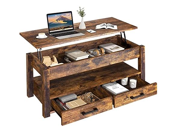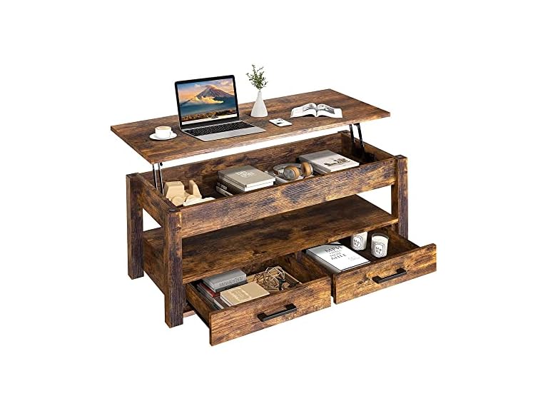 - (1) FABATO 41.7'' Lift Top Coffee Table with 2 Storage Drawer Hidden Compartment Open Storage Shelf for Living Room Dining Table Reception Room Rustic Brown