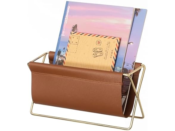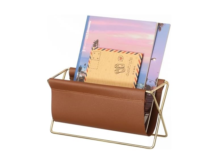 - Fabulaxe Contemporary & Classic Gold-Tone Metal Magazine Holder Spacious Brown Faux Leather Compartments for Organizing Magazines Newspapers & Files Ideal in Living Rooms Offices and Reading Corners