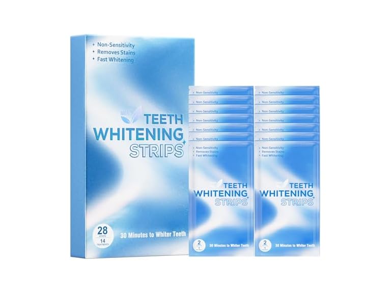 - 【Professional Teeth Whitening Strips】Achieve a brighter, more confident smile with these advanced whitening strips, clinically proven to remove up to years of stains in just 14 days. Enamel-safe and peroxide formula gently whitens teeth without sensitivity, perfect for daily use at home or on the go. Includes 28 strips (14 treatments) for full upper and lower coverage.
