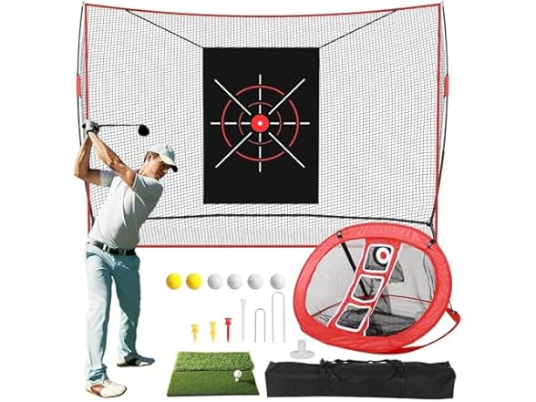 - COMPLETE ACCESSORIES: Golf Net, 10 x 7FT Heavy Duty Golf Practice Net with Golf Mat, Golf Chipping Network x1, Target Cloth, 6 Golf Balls, 8 Golf Tees Holder, Golf Training Nets for Indoor and Outdoor Use