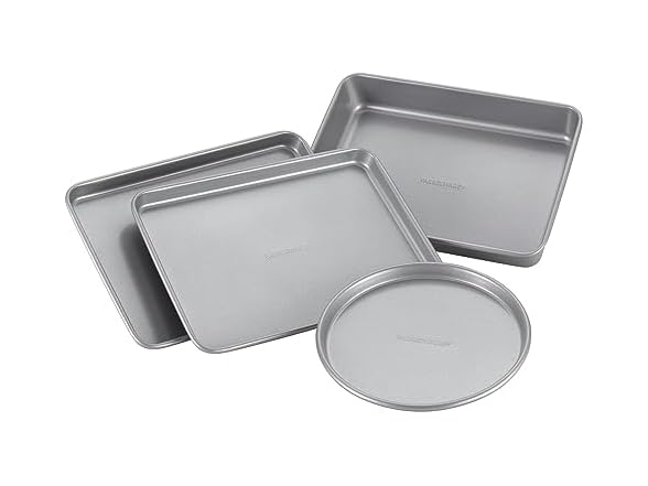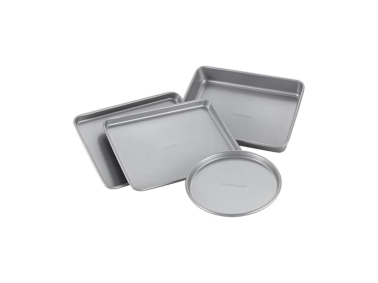 Farberware Bakeware meets the demands of all the busiest kitchens, and this 4-Piece Farberware 57775 Bakeware Nonstick Toaster Oven Pan Set is designed for creating toaster oven favorites. Just the right sizes for the Farberware Toaster Oven, the bake pans in this set make it easy to enjoy homemade pizzas, cookies and even smaller casseroles. The toaster oven baking tray set includes two 10-inch x 7-inch cookie trays perfect for baking chocolate chip cookie or biscotti, a 10-inch x 7-inch cake pan for creating strawberry cake or brownies, and a 7-inch pizza pan for making french bread pizzas. Product dimensions are as follows: Cake and Cookie Pans are 10" L x 7" W (interior), 10.8" x 7.5" (exterior). Pizza Pan is 7" L x 7" x W (interior), 7.5" x 7.5" (exterior). Featuring heavy-duty steel construction, the durable toaster oven pans reliably resist warping and heat evenly to help reduce hot spots that can burn baked goods. Nonstick inside and out delivers great food release with quick cleanup. Each toaster oven pizza tray, cake pan, and cookie pan is oven safe to 450°F. Even better, this entire mini tray set makes an ideal addition to the standard-size bakeware and other pans in the Farberware Bakeware collection.