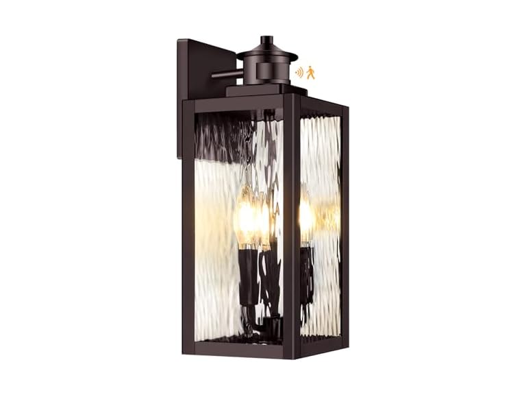 - Exquisite Water Ripple Glass & Wide Application: Designed with beautiful water-ripple glass, these motion lights for outside will reflect a beautiful halo of light, adding a modern, stylish, and cozy atmosphere to your home, bringing you a better life! It's also suitable for any outdoor use as security lights in your exterior porch, garage, patios, corridors, balconies, and terraces. A safe guardian guides your way home throughout the whole year