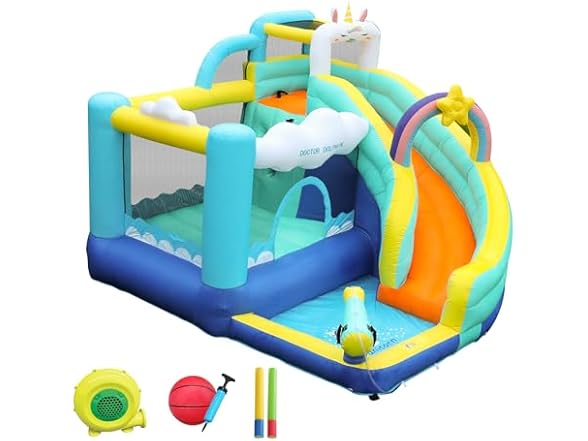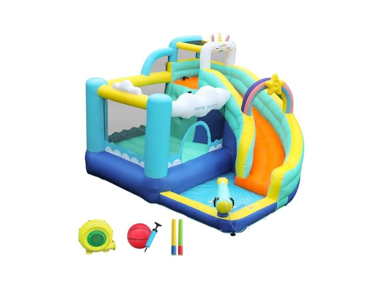 - 【6-IN-1 Unicorn WATER SLIDE BOUNCE HOUSE】This 6-in-1 water bounce house features a variety of entertainment zones including long slide, huge splash pool, bounce area , climbling wall basketball hoop and water gun which can make more fun for your kids.The pool can be filled with water and ocean balls.