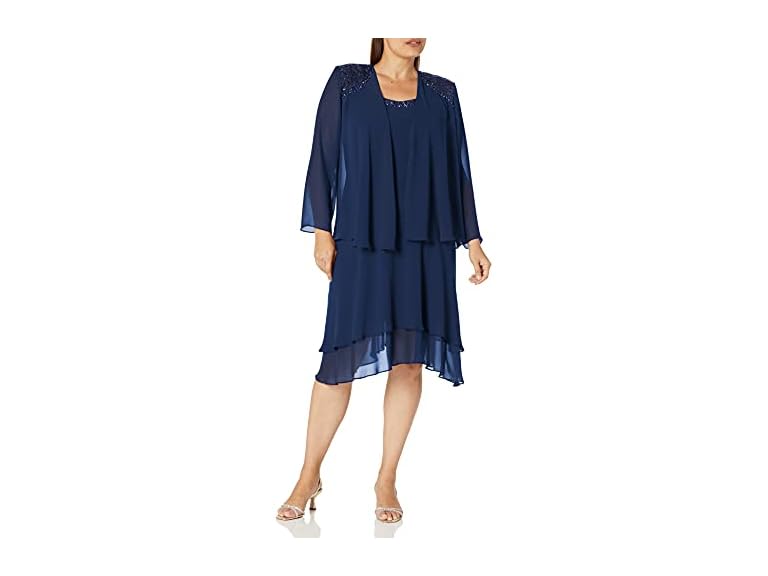 - (1) S.L. Fashions Women's Plus Size Embellished Tiered Mother of The Bride Gown with Jacket, Wedding Guest, Formal Event Dress, Navy, 20W