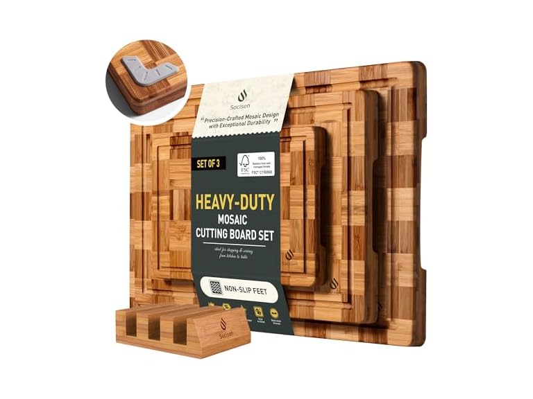 - 5-Layer Thickened Construction for Unmatched Durability: Crafted with a 5-layer bamboo splicing technique, these boards are twice as thick as standard cutting boards, engineered to resist cracks and warping even with heavy use. Each board is hand-sanded by skilled artisans and finished with food-grade mineral oil (regular re-oiling recommended) to protect both your knives and the board itself. Built to last, they’re a reliable addition to your kitchen for years.