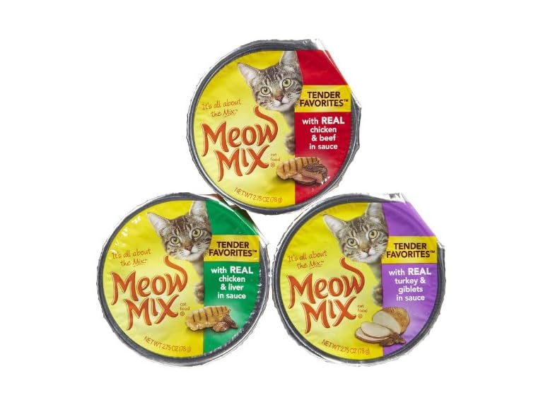 Flavors Include: Tender Favorites® With Real Chicken & Liver in Sauce (4 cups) Tender Favorites® With Real Chicken & Beef in Sauce (4 cups) Tender Favorites® With Real Turkey & Giblets in Sauce (4 cups) Description Tender Favorites® With Real Chicken & Beef in Sauce brings together two delicious favorites in a savory sauce. Each cup is also fortified with nutrients and minerals that help keep your cat vibrant and healthy. With wholesome ingredients and irresistible taste it's no wonder that cats ask for it by name! Shredded real chicken and beef in one cup High-quality protein helps maintain overall health Balanced for 100% complete nutrition for kittens and adult maintenance Nutrition Ingredients FISH BROTH, TUNA, CHICKEN, BEEF, CHICKEN LIVER, MODIFIED TAPIOCA STARCH, WHEAT GLUTEN, SOYBEAN OIL, NATURAL AND ARTIFICIAL FLAVORS, CALCIUM SULFATE, GUAR GUM, SALT, DRIED EGG PRODUCT, VITAMINS (VITAMIN E SUPPLEMENT, THIAMINE MONONITRATE, NIACIN, VITAMIN A SUPPLEMENT, CALCIUM PANTOTHENATE, RIBOFLAVIN SUPPLEMENT, PYRIDOXINE HYDROCHLORIDE, VITAMIN B12 SUPPLEMENT, MENADIONE SODIUM BISULFITE COMPLEX (SOURCE OF VITAMIN K ACTIVITY), FOLIC ACID, BIOTIN), CARRAGEENAN, TITANIUM DIOXIDE (COLOR), CARAMEL COLOR, SODIUM TRIPOLYPHOSPHATE, MINERALS (FERROUS SULFATE, ZINC OXIDE, MANGANESE SULFATE, COPPER AMINO ACID COMPLEX, POTASSIUM IODIDE, SODIUM SELENITE), SODIUM NITRITE (TO PROMOTE COLOR RETENTION) Guaranteed Analysis Crude Protein (Min.) 10.0% Crude Fat (Min.) 2.0% Crude Fiber (Max.) 1.5% Moisture (Max.) 82.0% Ash (Max.) 3.0% Taurine (Min.) 0.05% Nutritional Statement Meow Mix® Tender Favorites® With Real Chicken & Beef in Sauce cat food is formulated to meet the nutritional levels established by the AAFCO Cat Food Nutrient Profiles for adult maintenance. Feeding Feed adult cats 2 to 3 cups (2.75 oz. per cup) per 4.5 pounds of body weight daily. Shredded real chicken and beef in one cup High-quality protein helps maintain overall health Balanced for 100% complete nutrition for kittens and adult maintenance Description Made with tasty chicken and liver covered in succulent gravy Tender Favorites® With Real Chicken & Liver in Sauce is also fortified with a wholesome blend of vitamins and minerals to help support your cat's health. With nutritious ingredients and irresistible taste this mix makes mealtimes as nutritious as they are delicious! Tasty mix of real chicken and liver in one cup High-quality protein helps maintain overall health Balanced for 100% complete nutrition for kittens and adult maintenance Nutrition Ingredients FISH BROTH, TUNA, CHICKEN, CHICKEN LIVER, WHEAT GLUTEN, MODIFIED TAPIOCA STARCH, SUGAR, CALCIUM SULFATE, POULTRY HEART, DRIED EGG PRODUCT, TRICALCIUM SULFATE, SALT, SODIUM TRIPOLYPHOSPHATE, NATURAL AND ARTIFICIAL FLAVORS, GUAR GUM, TITANIUM DIOXIDE (COLOR), VITAMINS (VITAMIN E SUPPLEMENT, THIAMINE MONONITRATE, NIACIN, VITAMIN A SUPPLEMENT, CALCIUM PANTOTHENATE, RIBOFLAVIN SUPPLEMENT, PYRIDOXINE HYDROCHLORIDE, VITAMIN B12 SUPPLEMENT, MENADIONE SODIUM BISULFITE COMPLEX (SOURCE OF VITAMIN K ACTIVITY), FOLIC ACID, BIOTIN) CARRAGEENAN, MINERALS (FERROUS SULFATE, ZINC OXIDE, MANGANESE SULFATE, COPPER AMINO ACID COMPLEX, POTASSIUM IODIDE, SODIUM SELENITE), SOYBEAN OIL, SODIUM NITRITE (TO PROMOTE COLOR RETENTION) Guaranteed Analysis Crude Protein (Min.) 10.0% Crude Fat (Min.) 1.8% Crude Fiber (Max.) 1.5% Moisture (Max.) 82.0% Ash (Max.) 3.0% Taurine (Min.) 0.05% Nutritional Statement Meow Mix® Tender Favorites® With Real Chicken & Liver in Sauce cat food is formulated to meet the nutritional levels established by the AAFCO Cat Food Nutrient Profiles for adult maintenance. Feeding Feed adult cats 2 to 3 cups (2.75 oz. per cup) per 4.5 pounds of body weight daily. Tasty mix of real chicken and liver in one cup High-quality protein helps maintain overall health Balanced for 100% complete nutrition for kittens and adult maintenance Description Tender Favorites® With Real Turkey & Giblets in Sauce Cat Food has a tender duo of high-quality protein sources in a delicious sauce for a taste that cats find irresistible. Essential nutrients complete this wholesome and tasty meal. Tasty mix of turkey and giblets High-quality protein helps support overall health Balanced for 100% complete nutrition for kittens and adult maintenance Nutrition Ingredients FISH BROTH, TUNA, TUNA BY-PRODUCTS, CHICKEN, TURKEY, POULTRY GIBLETS, MODIFIED TAPIOCA STARCH, WHEAT GLUTEN, NATURAL AND ARTIFICIAL FLAVORS, SOYBEAN OIL, SUGAR, GUAR GUM, CALCIUM SULFATE, DRIED EGG PRODUCT, TRICALCIUM PHOSPHATE, SALT, SODIUM TRIPOLYPHOSPHATE, CARAMEL COLOR, VITAMINS (VITAMIN E SUPPLEMENT, THIAMINE MONONITRATE, NIACIN, VITAMIN A SUPPLEMENT, CALCIUM PANTOTHENATE, RIBOFLAVIN SUPPLEMENT, PYRIDOXINE HYDROCHLORIDE, VITAMIN B12 SUPPLEMENT, MENADIONE SODIUM BISULFITE COMPLEX (SOURCE OF VITAMIN K ACTIVITY), FOLIC ACID, BIOTIN), POTASSIUM CHLORIDE, TITANIUM DIOXIDE (COLOR), MINERALS (FERROUS SULFATE, ZINC OXIDE, MANGANESE SULFATE, COPPER AMINO ACID COMPLEX, POTASSIUM IODIDE, SODIUM SELENITE), CARRAGEENAN, MAGNESIUM SULFATE, SODIUM NITRITE (TO PROMOTE COLOR RETENTION), ROSEMARY EXTRACT Guaranteed Analysis Crude Protein (Min.) 11.0% Crude Fat (Min.) 1.8% Crude Fiber (Max.) 1.5% Moisture (Max.) 82.0% Ash (Max.) 3.0% Taurine (Min.) 0.05% Nutritional Statement Meow Mix® Tender Favorites® With Real Turkey & Giblets in Sauce cat food is formulated to meet the nutritional levels established by the AAFCO Cat Food Nutrient Profiles for adult maintenance. Feeding Feed adult cats 2 to 3 cups (2.75 oz. per cup) per 4.5 pounds of body weight daily. Tasty mix of turkey and giblets High-quality protein helps support overall health Balanced for 100% complete nutrition for kittens and adult maintenance