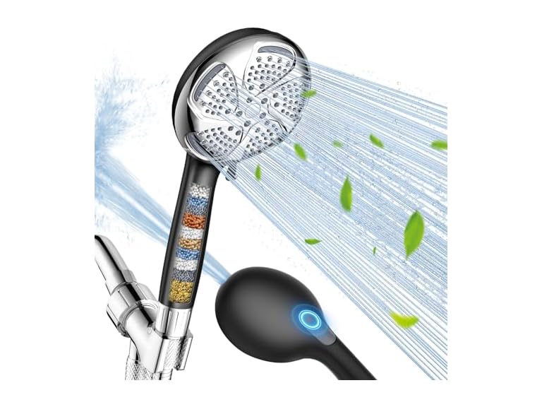 - 【6 Shower Spray Modes + Power Wash Modes】 Our high pressure handheld filtered shower head has 7 switchable settings (Rain, Massage, Mist, Rain & Massage, Rain & Mist, Water Saving and Power Wash modes). It meets various needs without complex settings for ease of use. Besides, do you tired of that disgusting soap scum and dried hair left behind after each shower? Now you can clean it all in seconds from up to 5ft away, without setting a foot in your shower room. Simply press the button on the back of the shower head to switch to power wash mode, quickly rinse off large areas and blast away the stubborn grime! Cleaning the shower room becomes quick and easy!