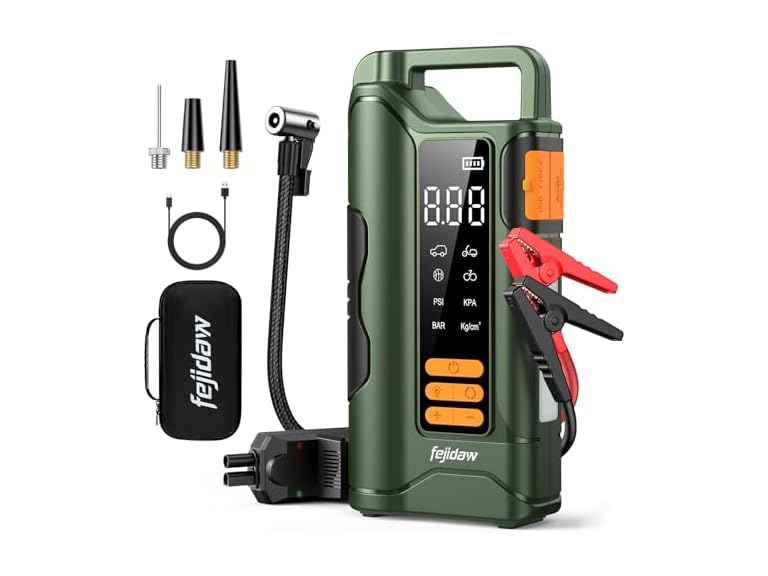 - (1) fejidaw Jump Starter with Air Compressor,5000A Car Battery Jumper Starter, 16000mAh Battery Jumper Starter Portable for 10L Gas/Diesel Engine with 160PSI Booster,LED Display & Light,Jumper Cables