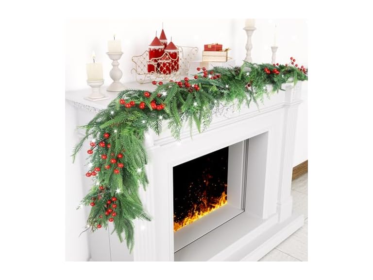 - (1) TISEMENT Norfolk Pine Cypress Garland with Red Berry, 6Ft Artificial Soft Christmas Pine Garland with10Ft Light String