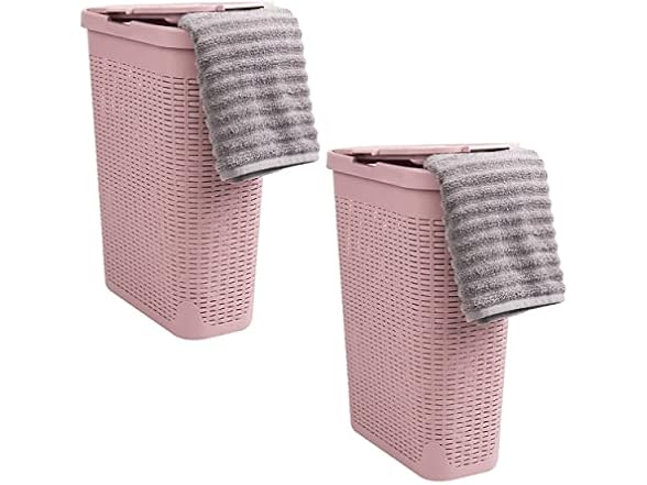 - (1) Mind Reader Slim Laundry Hamper with Lid, 40L Clothes Basket, Narrow Tapered Design with Ventilated Cutout Pattern, Plastic, Set of 2, Pink