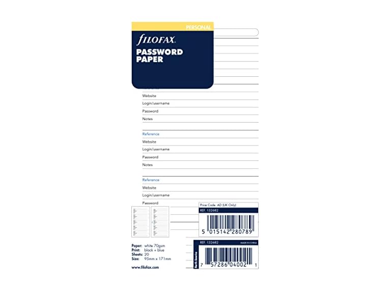- Filofax Personal Password Paper Refill, White, 95 x 171 mm