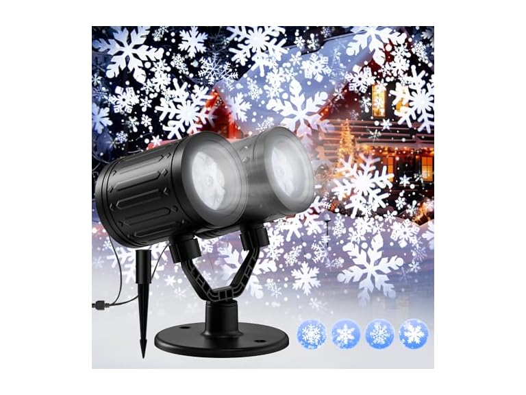 - Double Head Christmas Projector Lights Outdoor: Soft white dots and four dynamic snowflake patterns simulate a realistic snowfall effect, creating vivid scenes of various sizes and shapes, just like snowflakes falling on your wall or house. Even if you live in an area without snow, this Christmas light projector brings the magical vision of a white Christmas, filling your home with joy and delight for the whole family!