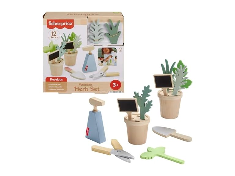 - (1) Fisher-Price Wood Pretend Play Toy Herb Garden & Tools Set, 12-Piece Wooden Playset for Preschool Kids Ages 3+ Years