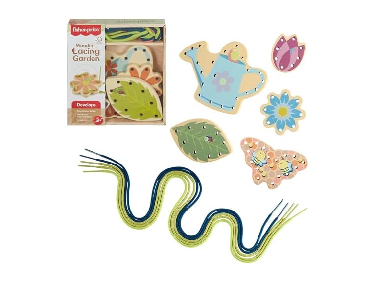 - (1) Fisher-Price Wood Preschool Toy Lacing Activity Cards, Tiny Garden 10-Piece Set for Fine Motor Skill Development Kids Ages 3+ Years